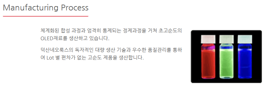 이 회사는 OLED를 구성하는 핵심요소인 유기재료를 생산하는 기업입니다. 2014년 12월 덕산하이메탈로부터 인적분할 방식으로 신설되었고 2015년 2월 코스닥 시장에 상장되었습니다.